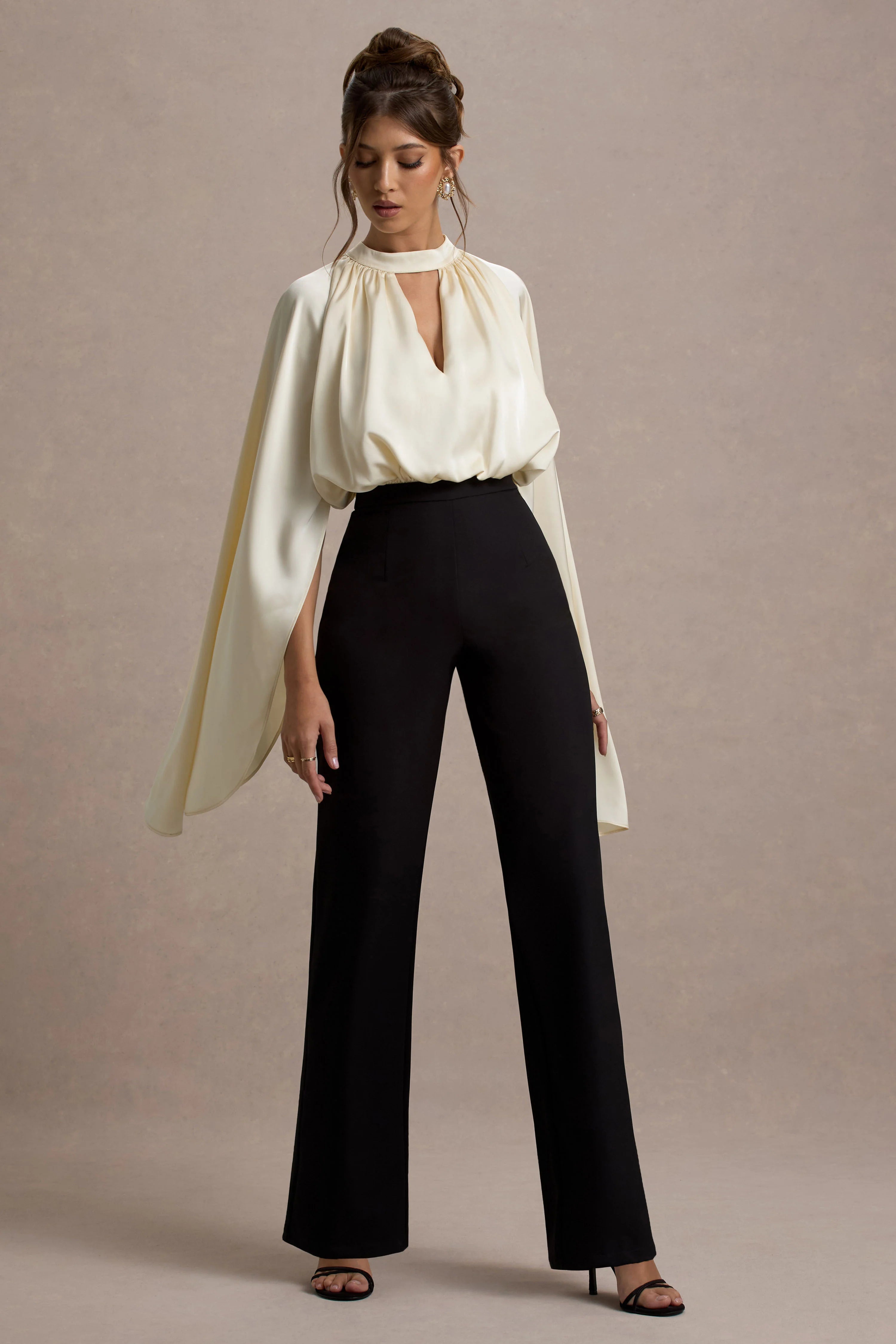 Every wardrobe needs a formal jumpsuit like Amity. Designed in a complimenting mix of sumptuous cream satin and classic black crepe, this wide-leg jumpsuit is defined by its extravagant waterfall sleeves, keyhole cut-out and button-closed collar.
