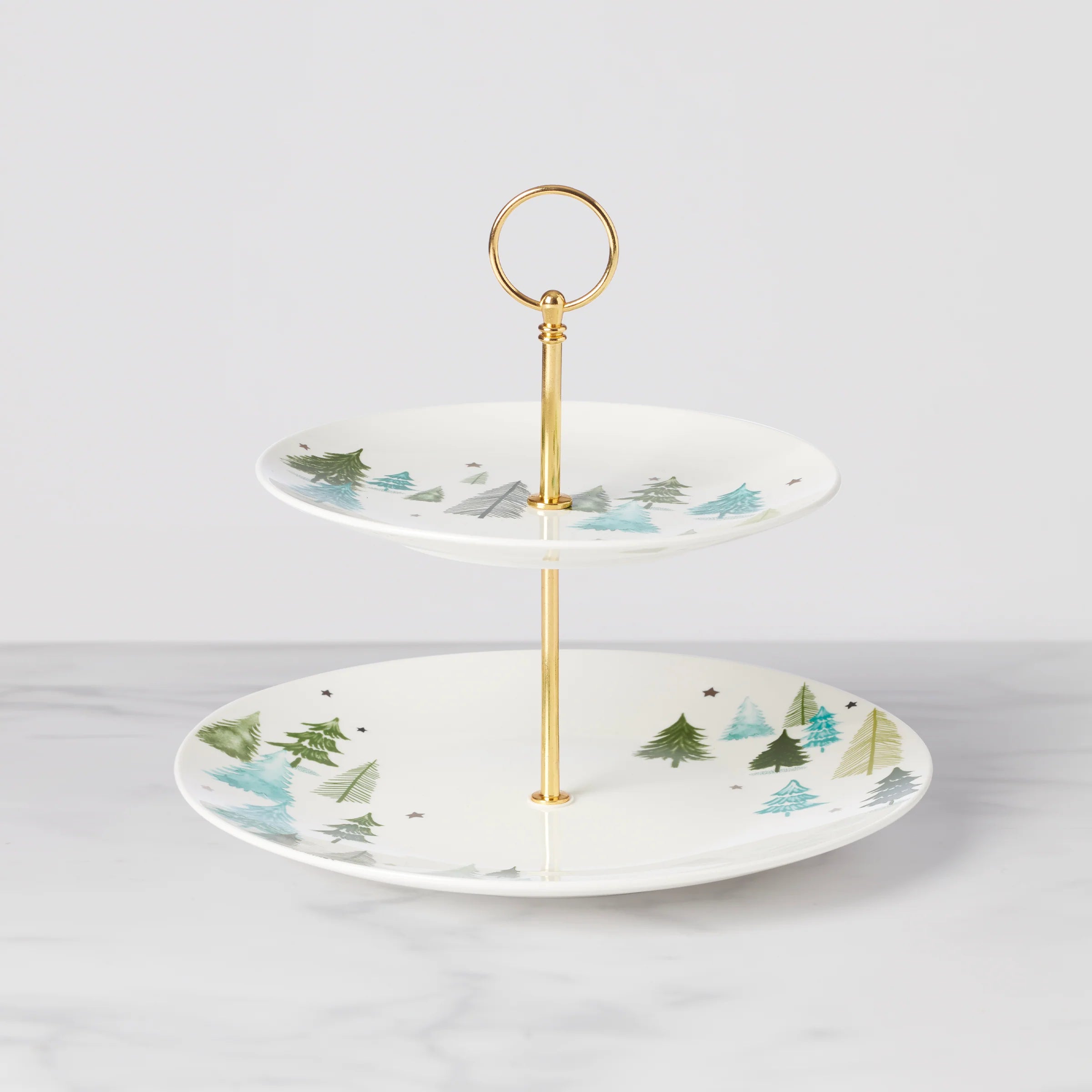 Serve a sweet double-layered dessert. With two levels of plating platforms to fit as many treats as you can carry. Crafted after a wonderful winter wonderland with evergreen trees set against an arctic white scene.
