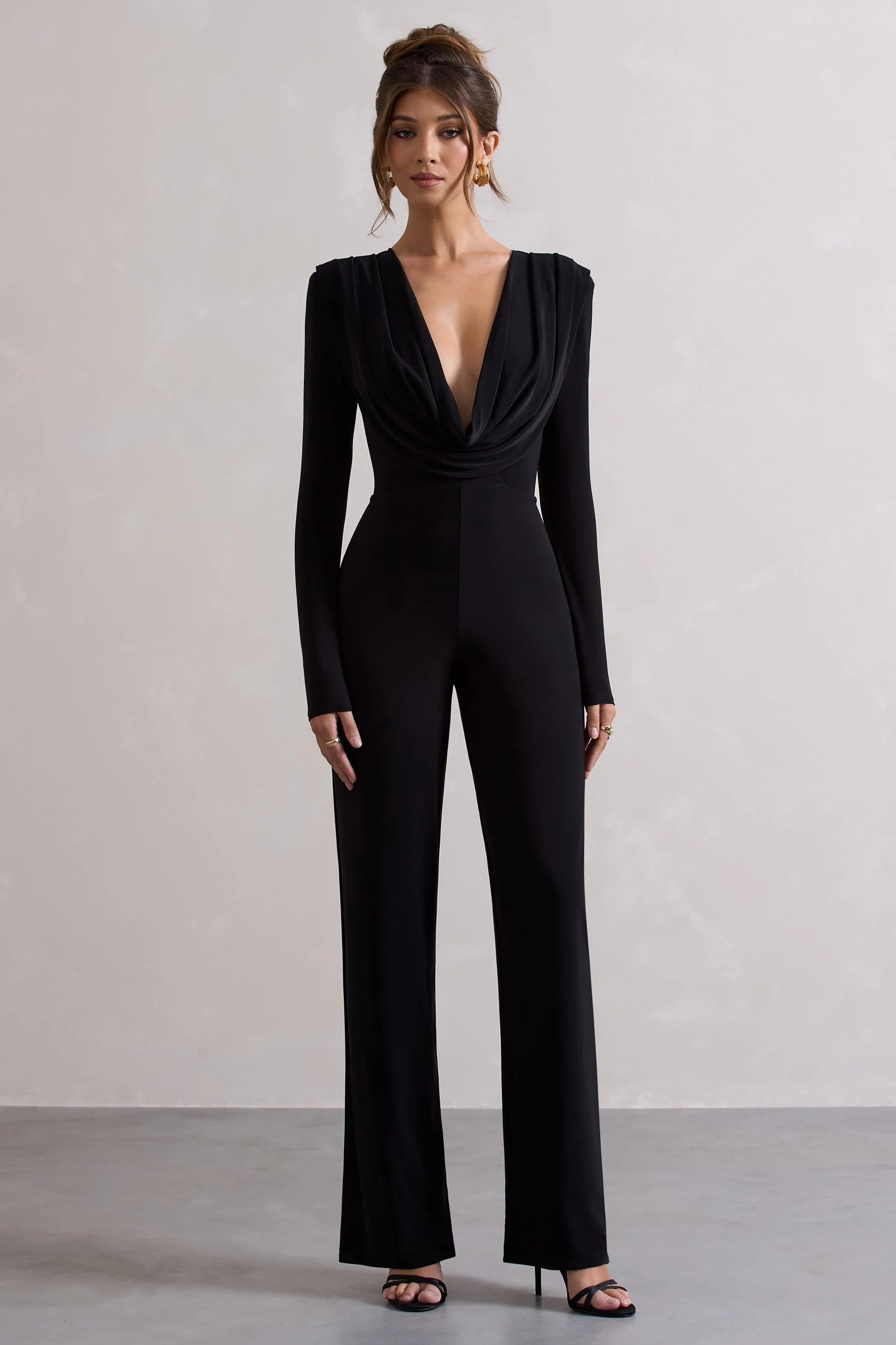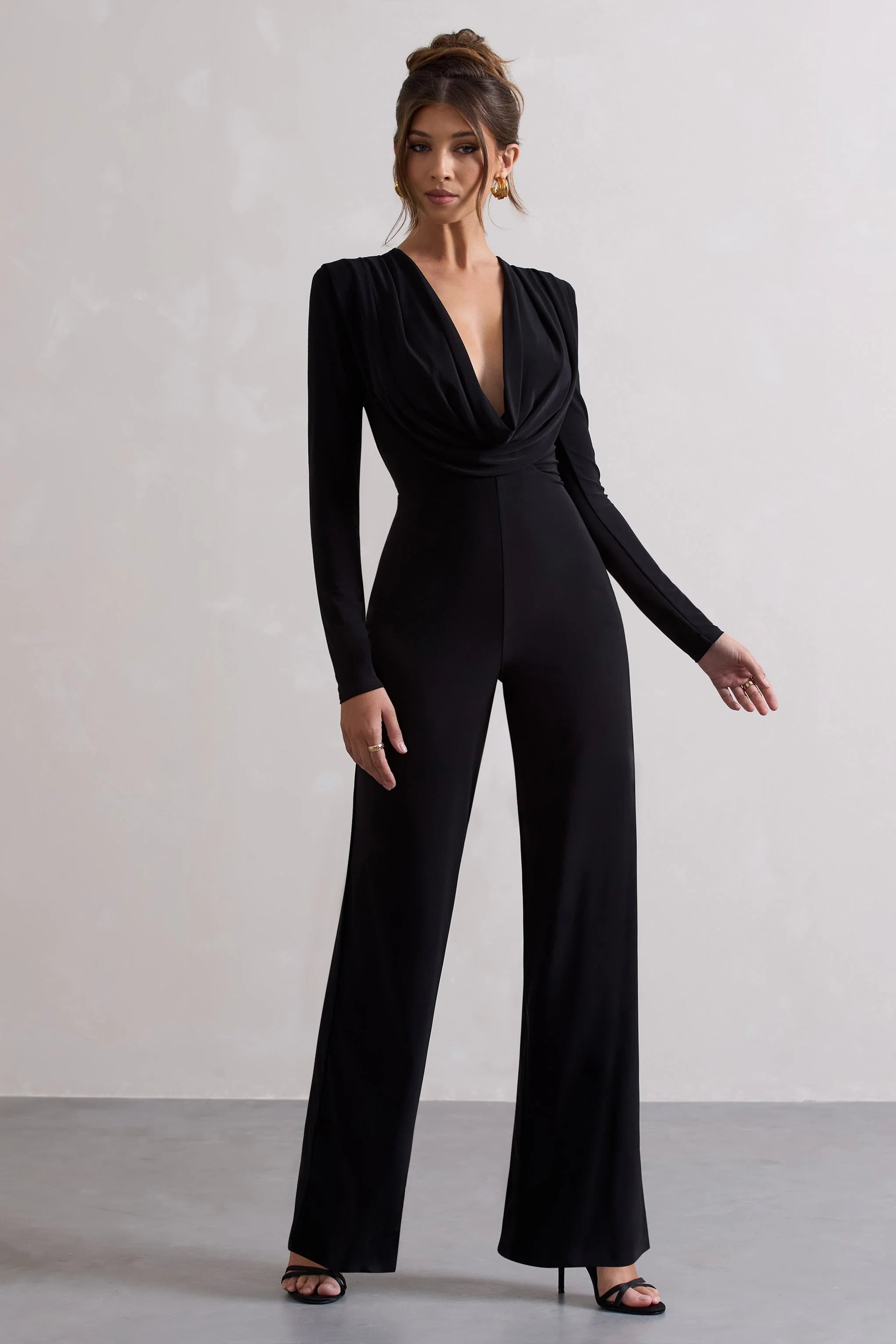 Every wardrobe needs a black jumpsuit like Elisha. Simple yet lavish, this wide-leg jumpsuit offers demure long sleeves and a wrapped plunge neckline. Take Elisha from day to night by styling yours with some gold earrings and a statement black clutch.
