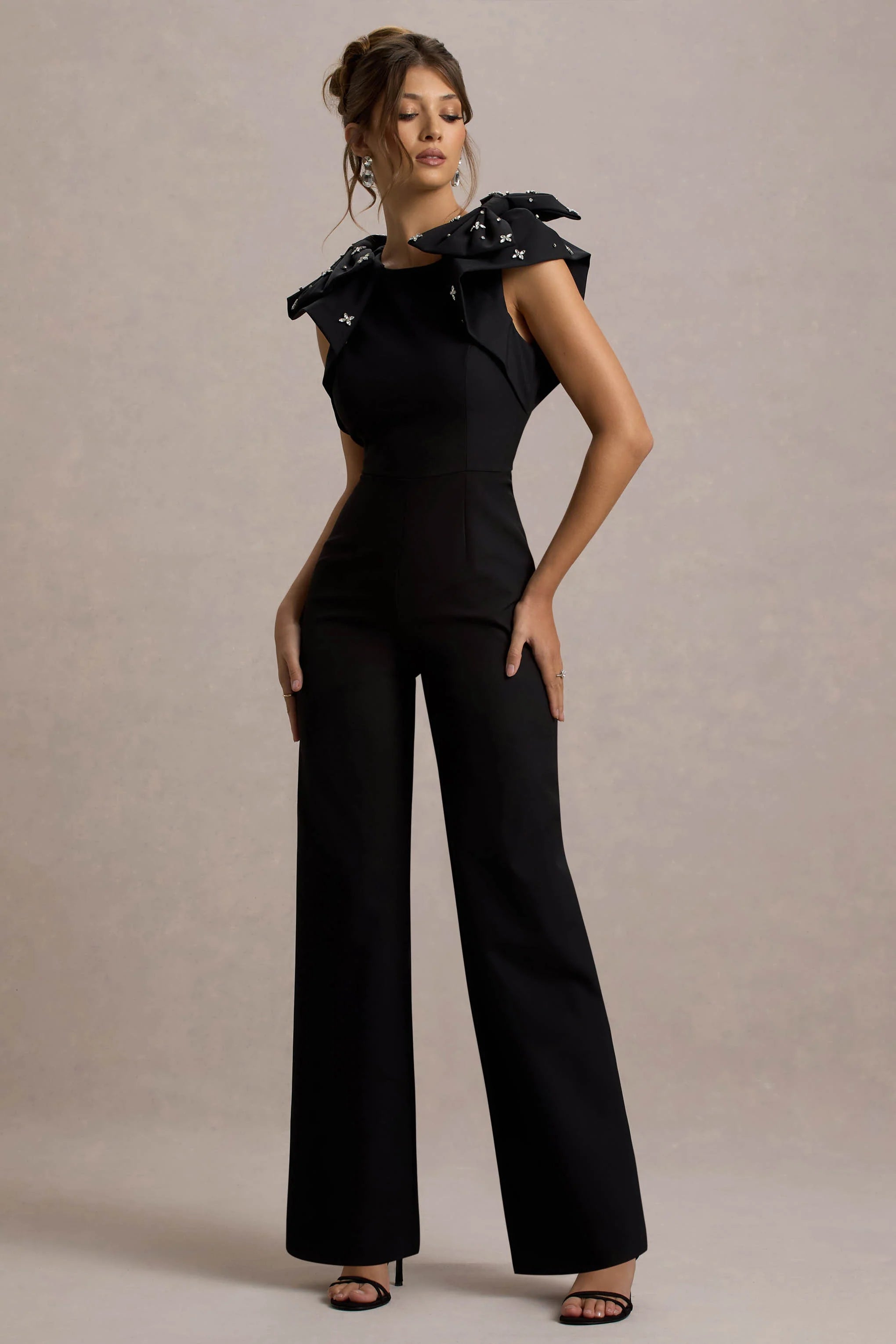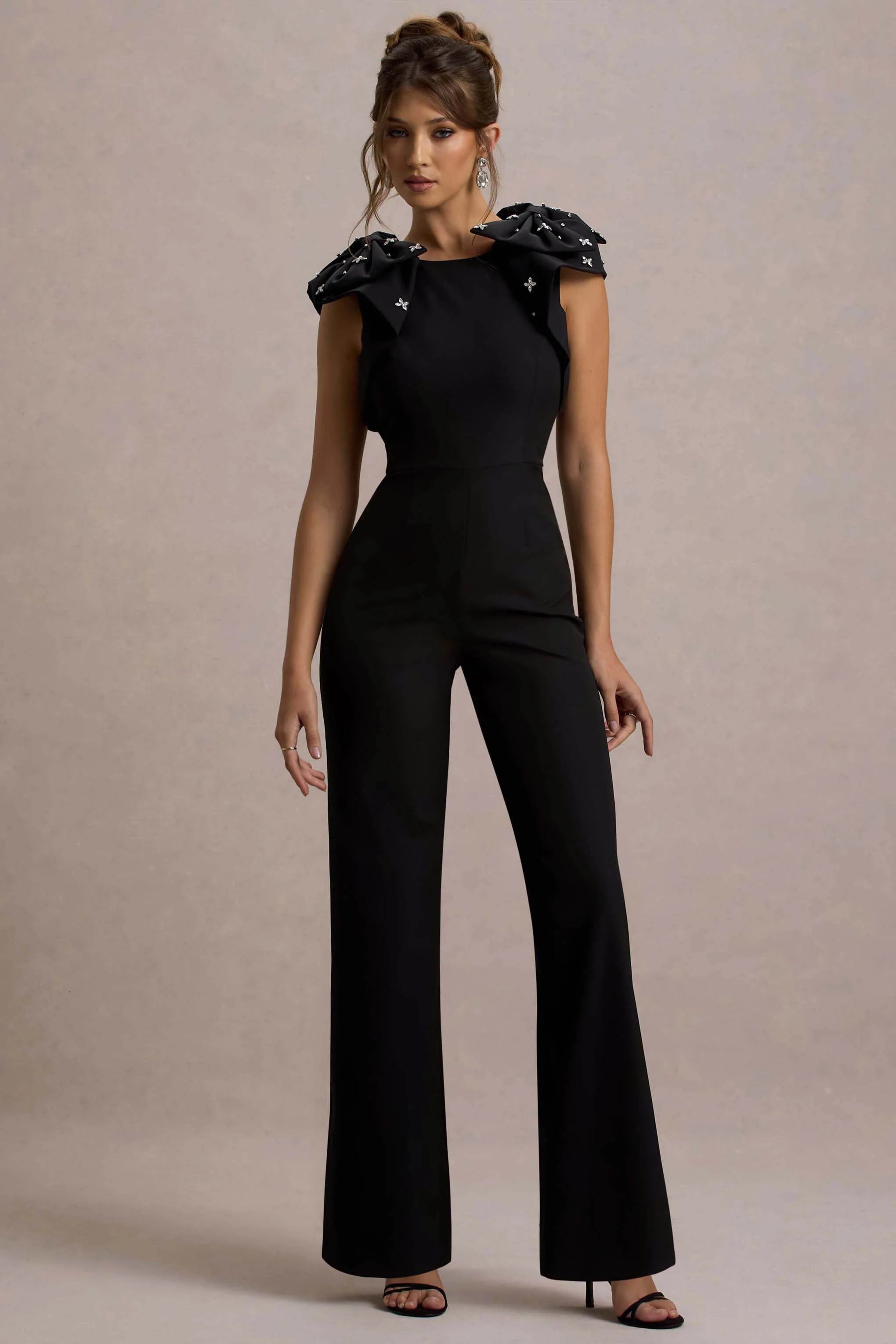 Defined by sophisticated details that turn heads, Elma is a striking option for your next special occasion. Crafted from premium black crepe, this straight-leg jumpsuit features embellished bows cascading down the bodice, adding a touch of sparkle to its sleek silhouette. The tailored fit effortlessly sculpts your figure, while the structured neckline brings an elegant finish.