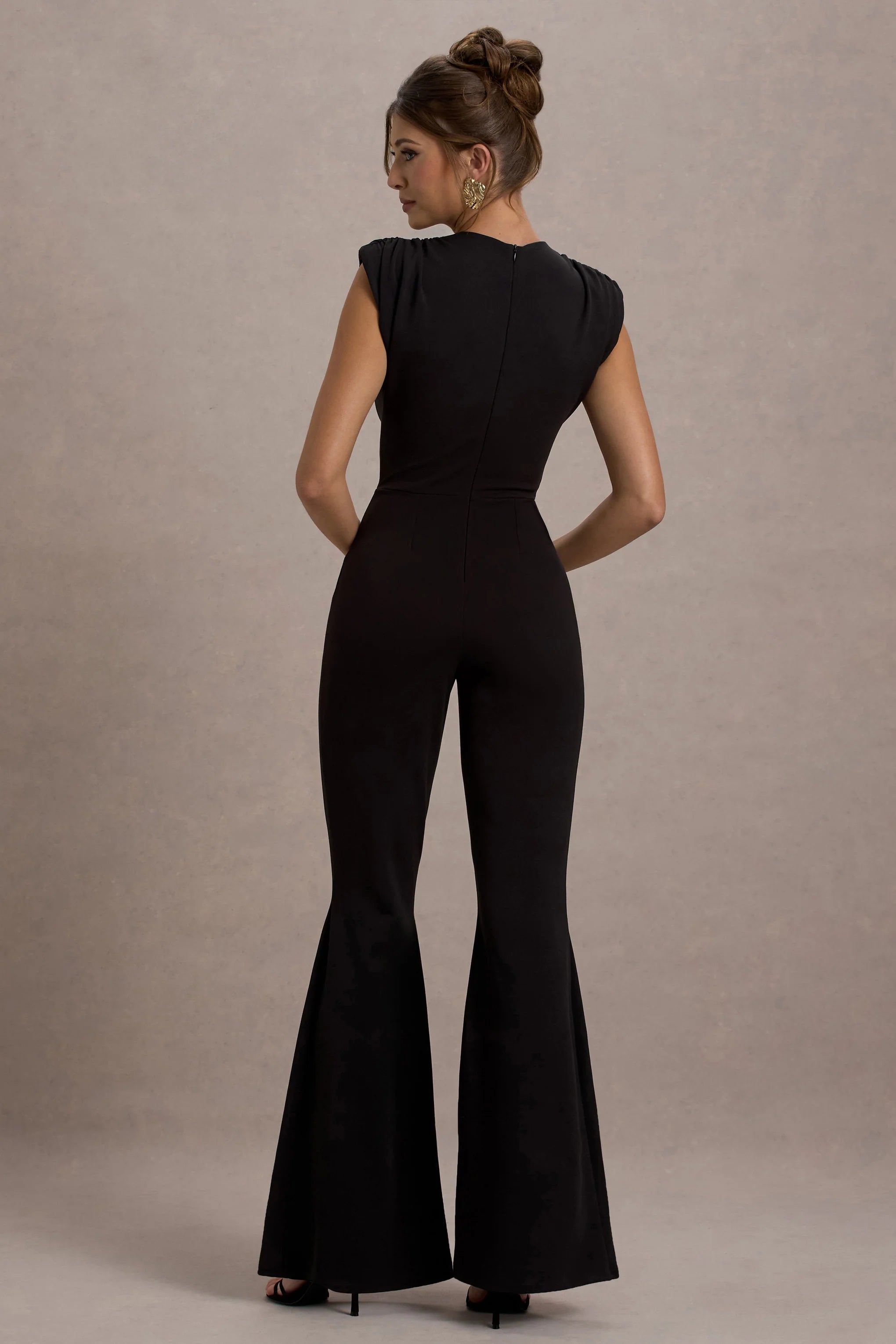 Defined by its sleek silhouette and dramatic details, Elyna is a statement-making option for your next special occasion. Crafted from our premium scuba crepe, this black jumpsuit features a sophisticated high neckline and expertly draped bodice that creates a chic, sculpted look. The flared-leg design adds a touch of retro glamour, elongating your silhouette for a striking finish. Keep Elyna at the forefront of your look with platform heels and bold earrings, and complete the ensemble with a sleek ponytail for a flawless, head-turning appearance at your next event.