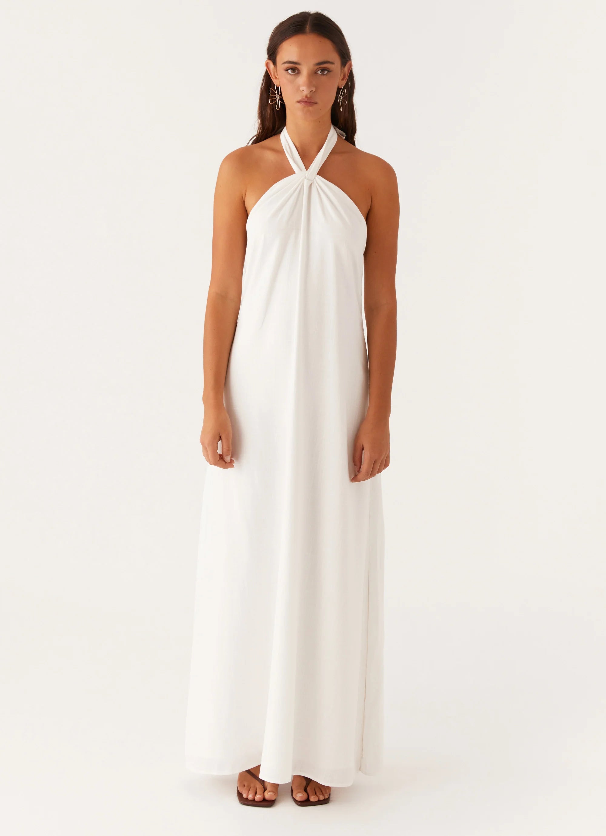 Embrace the essence of summer nights in the Golden Child Linen Maxi Dress. With its elegant halterneck design and stunning open back. this fully lined dress flows beautifully. capturing the light with every move. Perfect for balmy evenings and sunset gatherings. it's a must-have for your wardrobe.