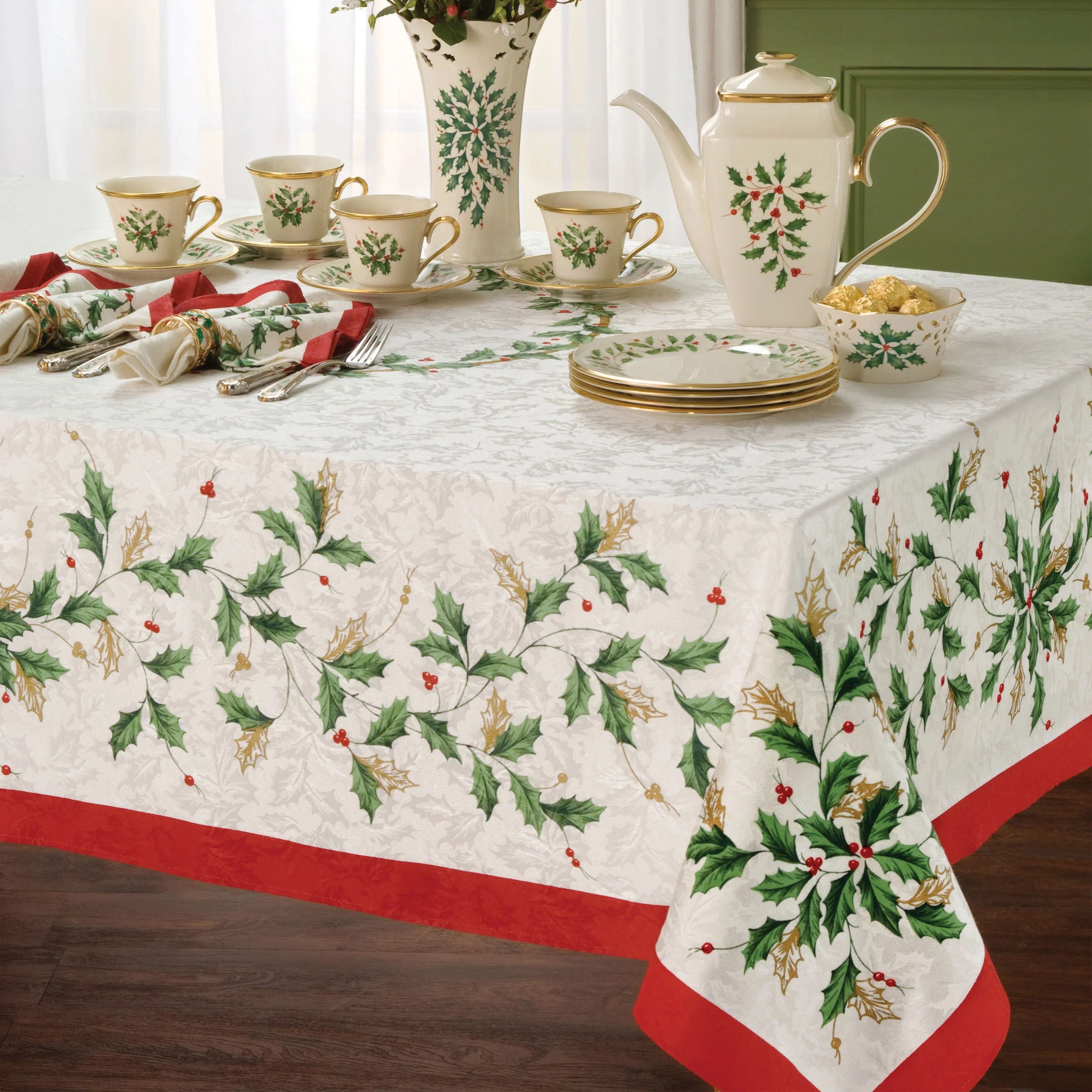 The Holiday 60" x 84" Tablecloth combines elegance with classic seasonal style. Featuring a bold, festive red border surrounding and a timeless pattern of holly leaves and berries.