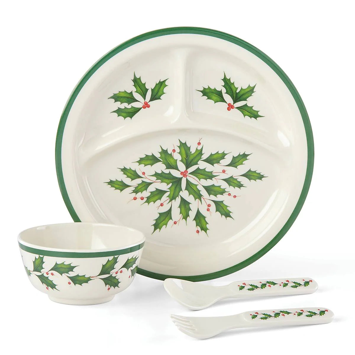 Perfect for your little one to join in on Christmas dinner. The Holiday? children's melamine set comes with a small bowl, fork, spoon and a plate with three sections.