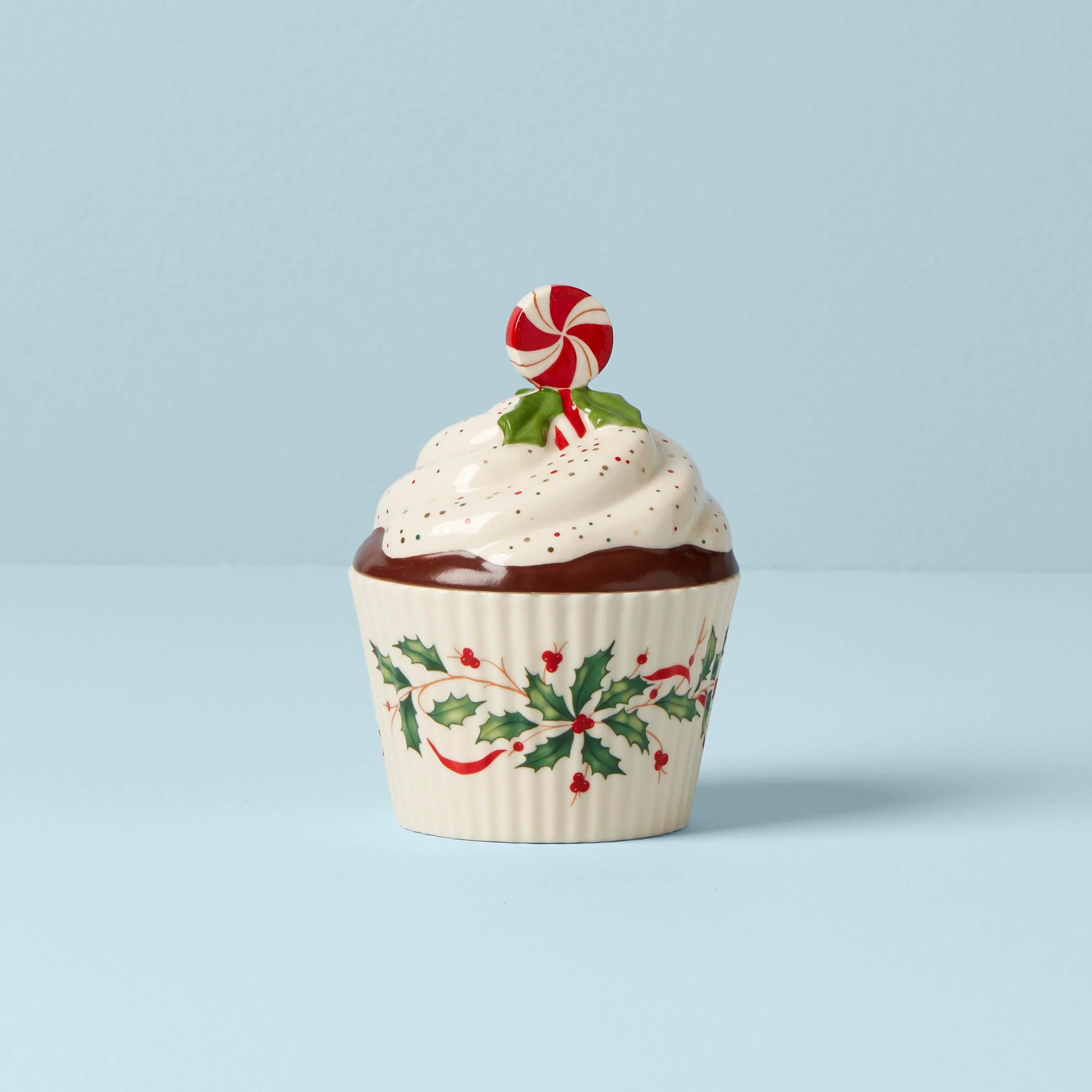 Enjoy a delicious surprise with this cupcake covered candy dish! Accented with holly leaves and speckled sprinkles, this hand-painted dish is perfect for holding small treats for your guests.