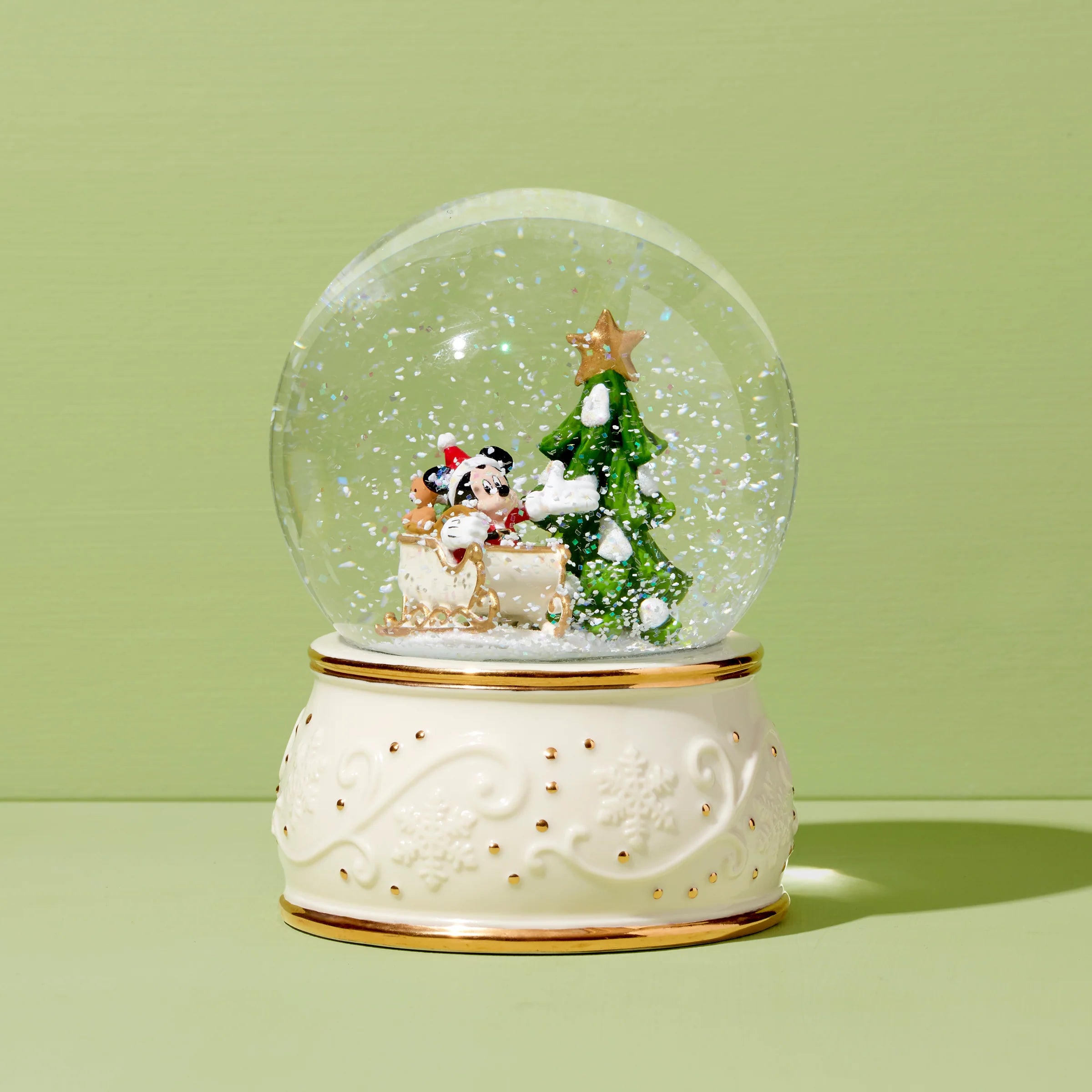 Celebrate Disney, the stories, and the memories that last a lifetime. Within this beautiful snow globe Mickey Mouse is riding through the snow in a festive scene.