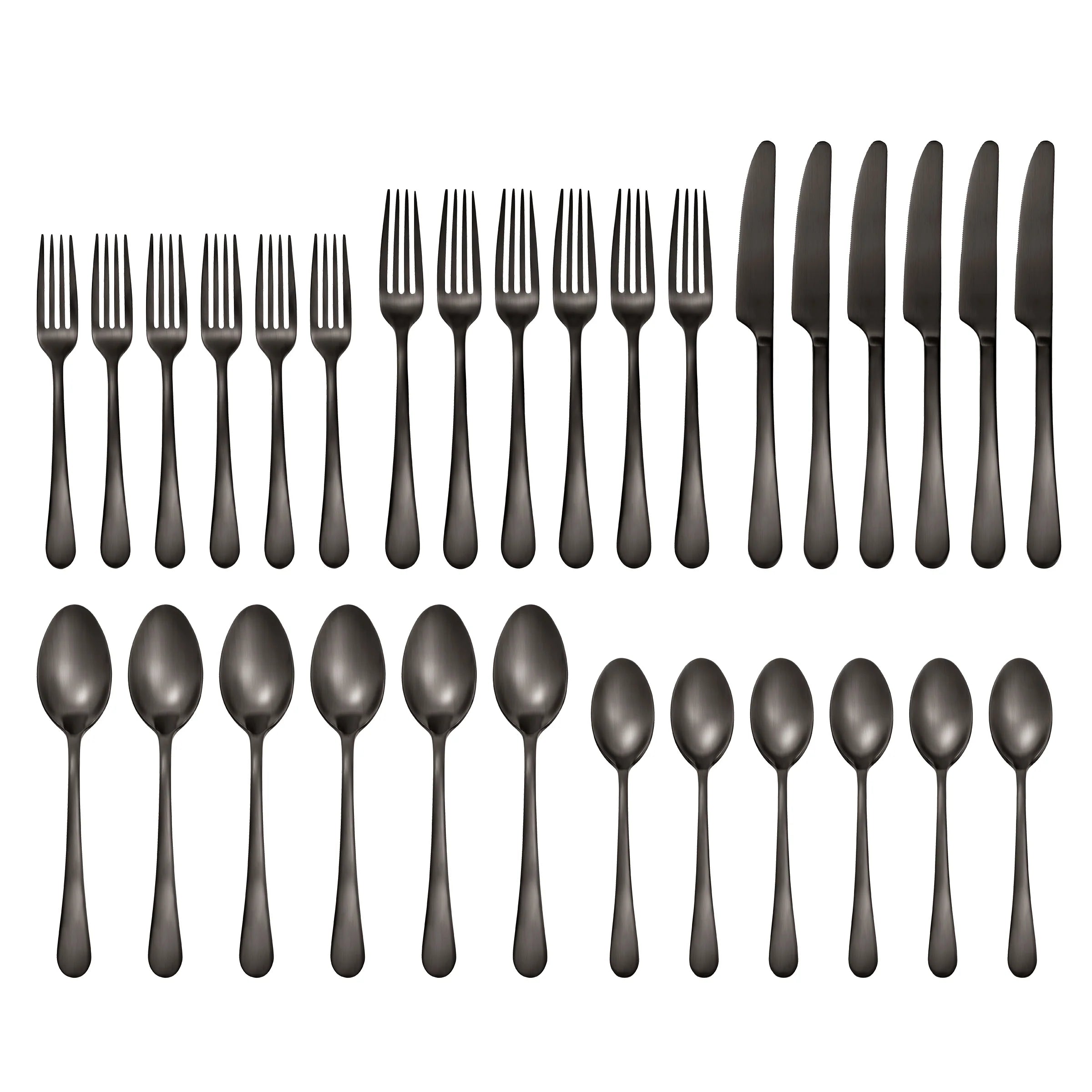 The Mirabella Gunmetal flatware set by Skandia; your new go-to set, no matter the occasion. It's so sleek and chic! Its curved silhouette features a sweeping arch and fully rounded tip, dressed in a moody satin gunmetal finish it makes a statement on your tabletop. A design that is precise and balanced, offering endless possibilities when it comes to styling your dining table.