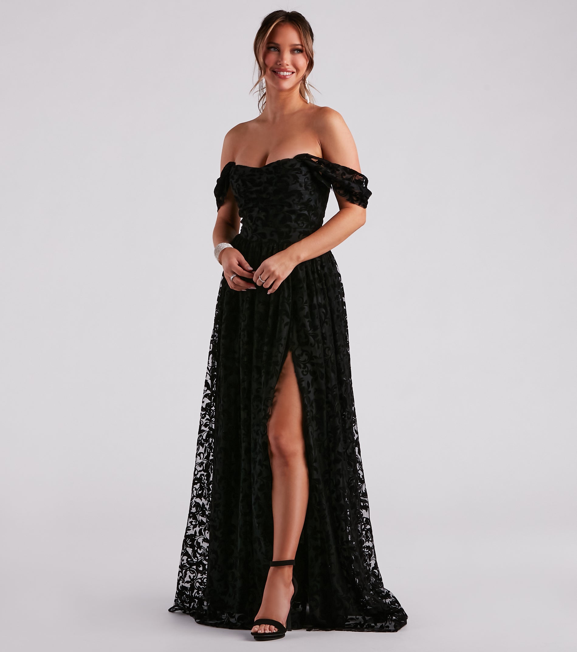 The elegant details on the Nyra formal dress make a divine impression at galas or black-tie weddings! She embodies beauty and grace in her off-the-shoulder, sweetheart neckline with non-slip grip lining, sheer short-sleeve cuffs, and a pleated bust with padding. Her flattering A-line silhouette effortlessly flares out from the waist down the floor length showcasing a sultry high-cut slit. The formal dress is composed of a sheer mesh fabric with a flocked velvet pattern and a stretchy knit lining. Style with a bracelet and ring set to complete your chic look!