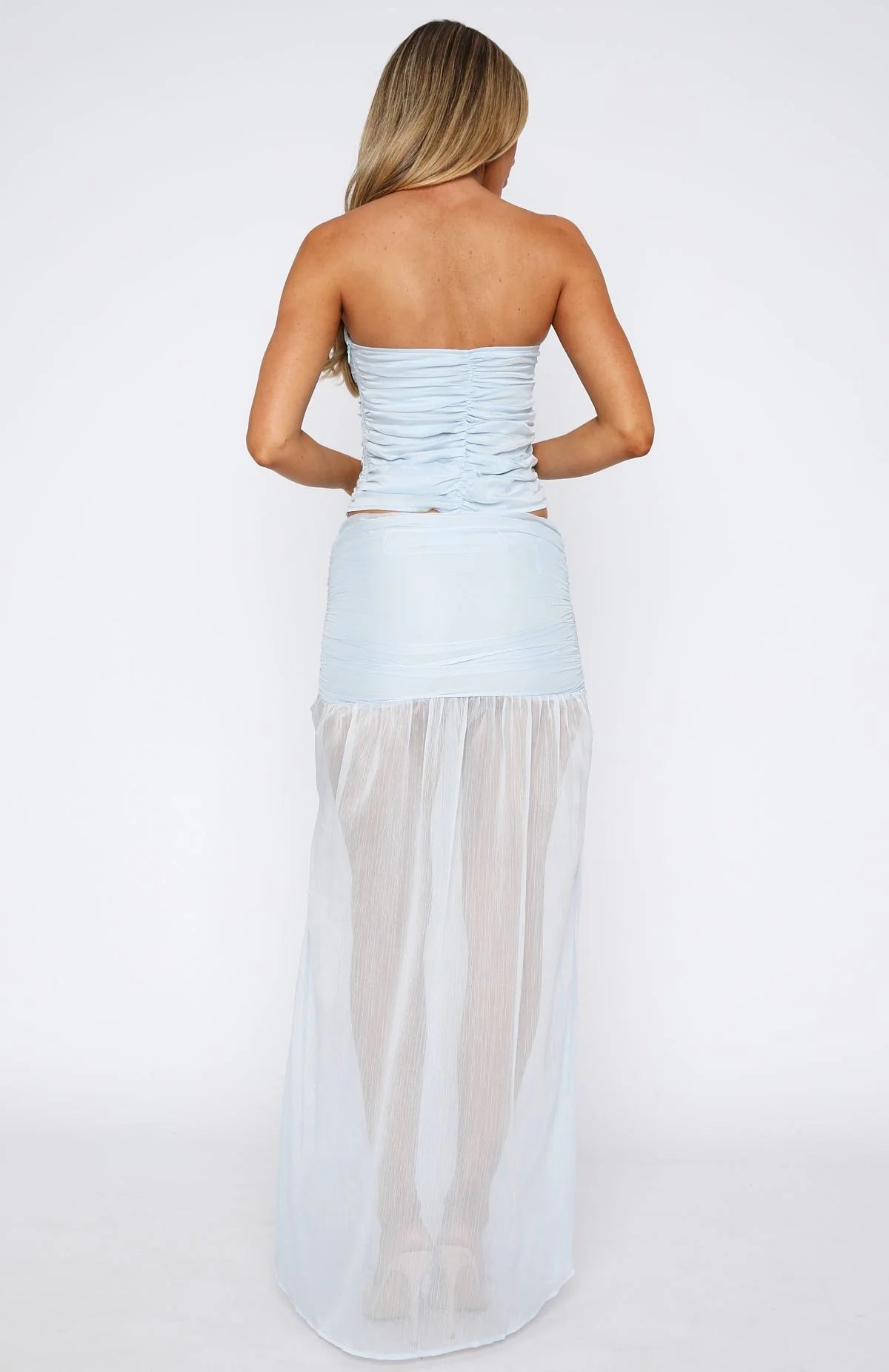 The On Stage Maxi Skirt Sky is your go-to for nights that call for a little extra glam! Featuring a thin waistband with invisible side zipper and clasp closure that can be worn low or mid waisted, side ruched detailing, partially lined, and high side split detailing. Style with the On Stage Strapless Top for a matching moment we adore!