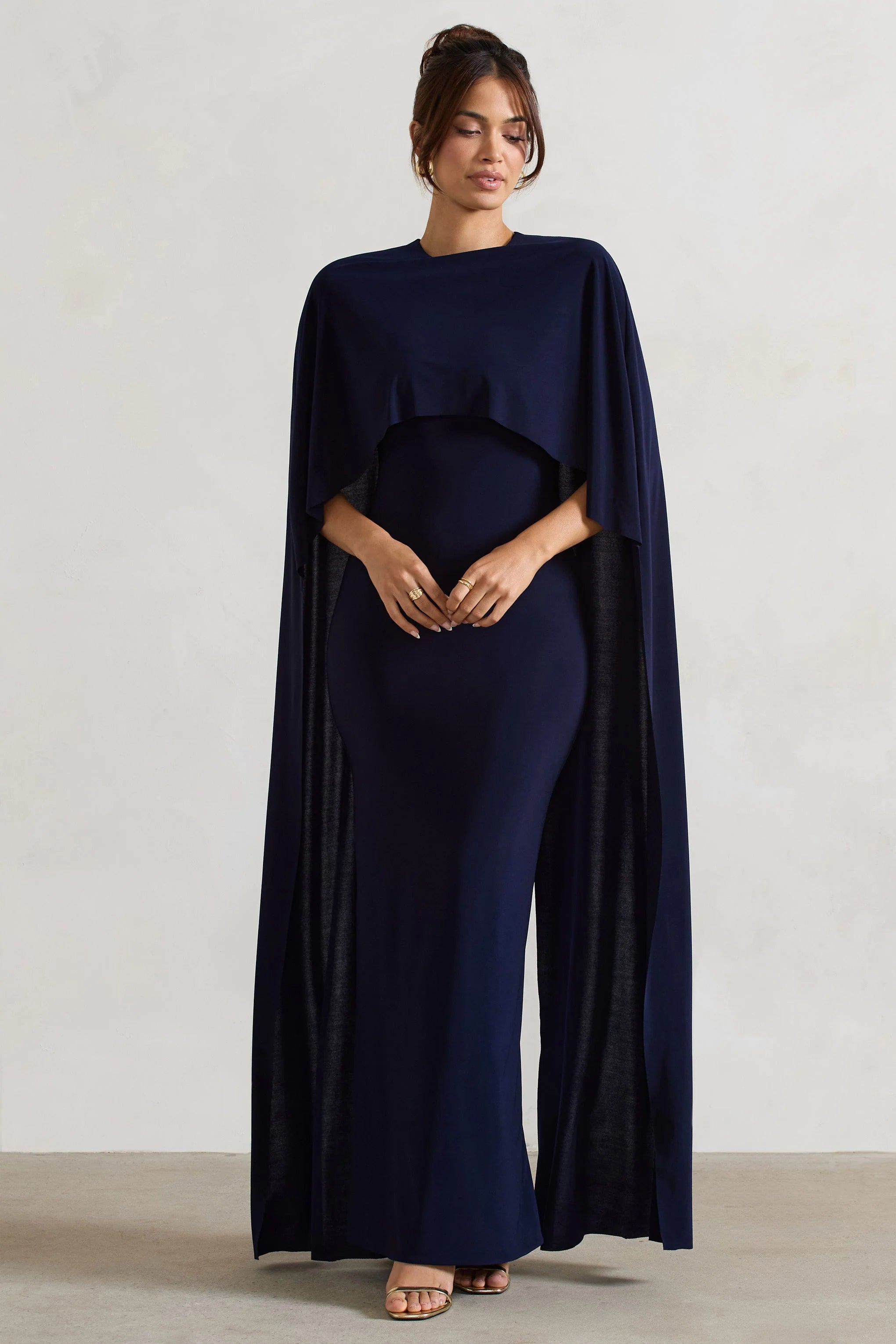 Captivate from all angles in Padma, our navy maxi dress. Crafted in a premium stretch jersey, Padma sculpts your frame with a flattering bodycon fit. Defined by floor length cape sleeves that command attention, try styling yours with a sleek bun and our Sanya earrings for the ultimate occasion look.