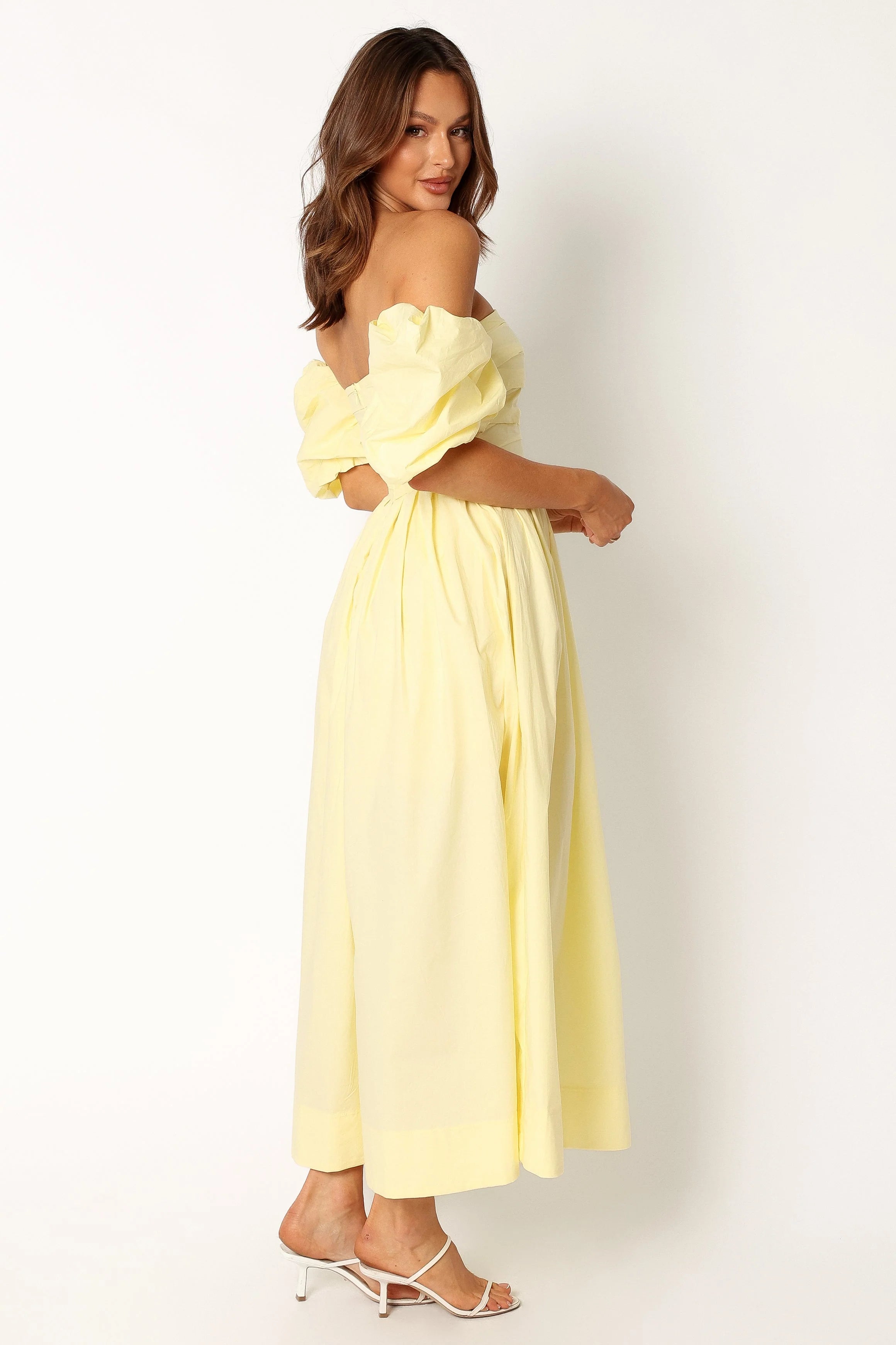 DETAILS The perfect dress for your next party, this off shoulder style dress is a must have for the spring season. Cut to midi-length and with a straight neckline, short elasticised sleeves and gathered pleated detail, it's effortlessly elegant - ideal for special occasions or simply looking good on any day of the week.