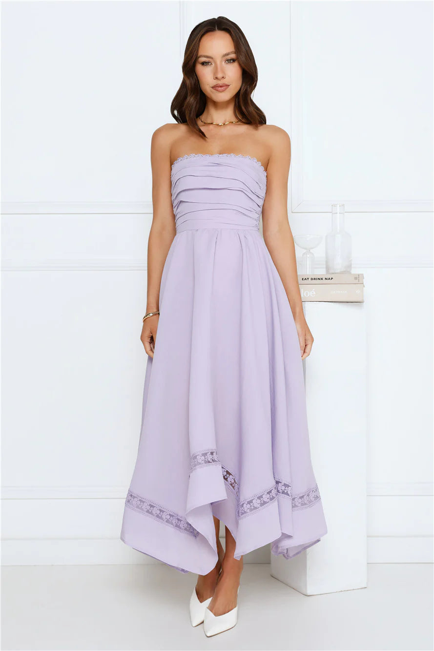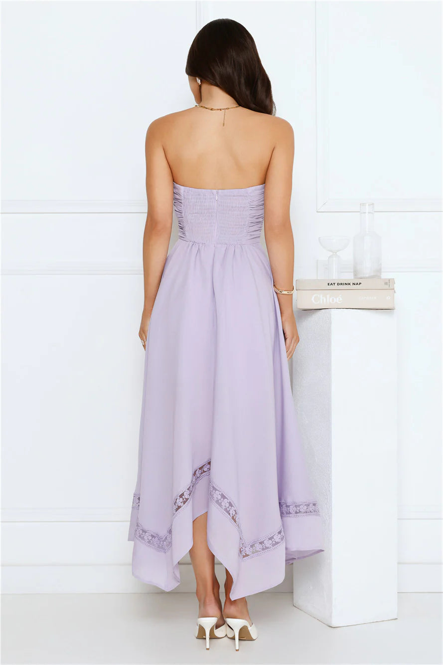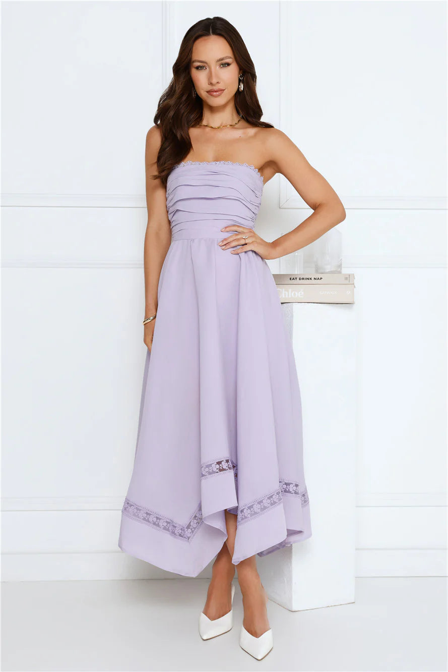 A dainty look we're in absolute love with. The Visit The Moon Strapless Midi Dress features an asymmetric pointed hem and a flowy skirt with an embroidered lace trim. Style with sandals and beachy waves.