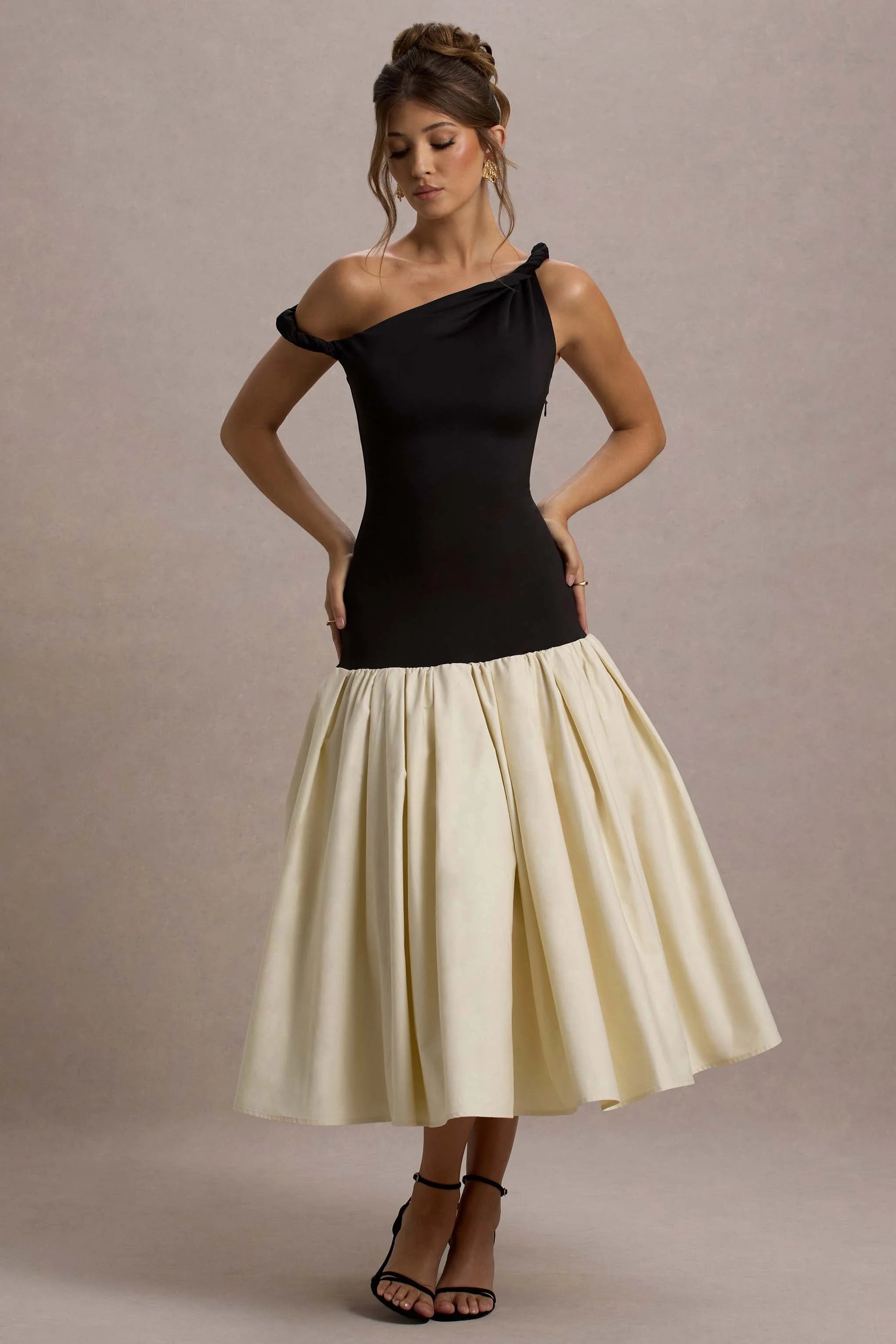 Offering up a playful feminine charm, gift your wardrobe this season with Whitley. Crafted in a premium jersey, this drop-waist midi dress boasts a twisted asymmetric neckline before falling to a cream cotton poplin volume skirt. For an elegant wedding guest ensemble, team yours with a pop of colour like Flashing Lights.