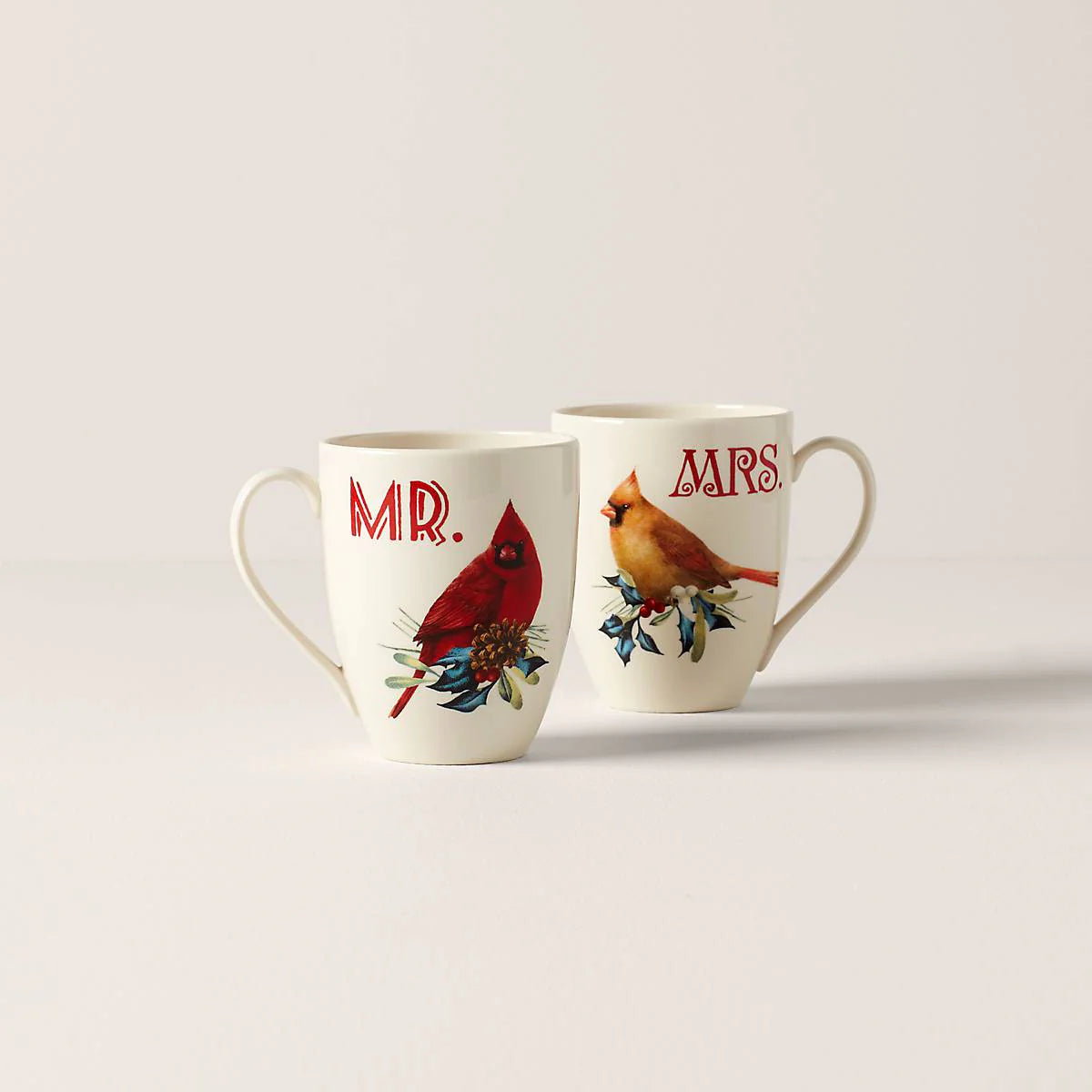 The beautiful evergreen boughs of the popular Winter Greetings® dinnerware pattern Perfect for the lovebirds! In this set of two mugs, an elegant male cardinal image is inscribed with the word "Mr." and a female cardinal with the word "Mrs." Crafted in shimmering porcelain, this pair of mugs is just the right gift for your favorite couple.